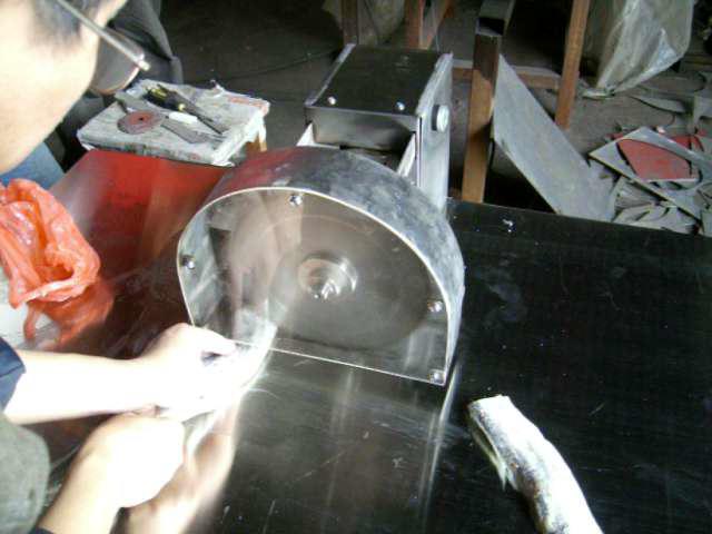 本款去头机可以方便地对带鱼和0.5斤以下的各种鱼类进行去头加工。刀片高度可调。如需对更大的鱼进行去头加工,可以另行专门设计。